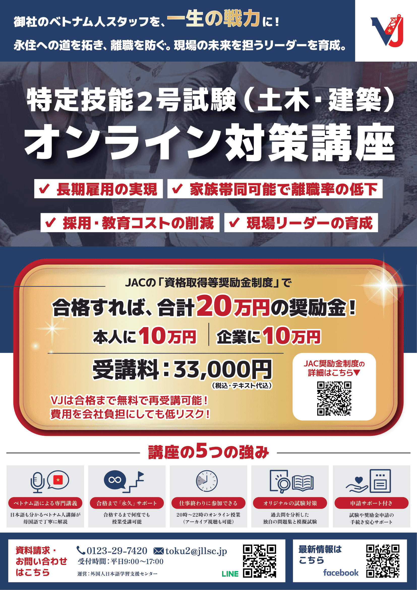 VJはベトナム人労働者のキャリアアップと、企業の長期雇用の要となる特定技能2号試験のオンライン対策講座です。